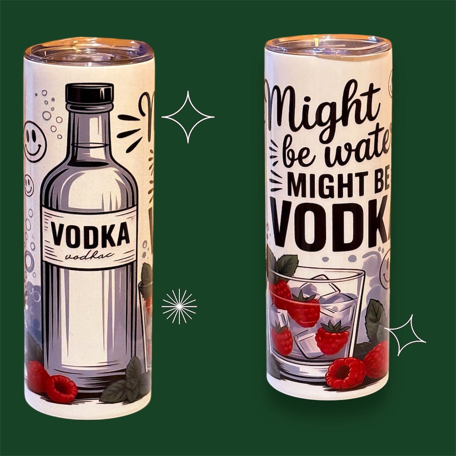 Stay hydrated… or maybe not 😉 Our “Might Be Water, Might Be Vodka” Tumbler is perfect for those who enjoy humor with their sips. Featuring a playful vodka-themed illustration with fresh berries and bold typography, this tumbler is a fun statement piece for parties, weekends, or everyday laughs.